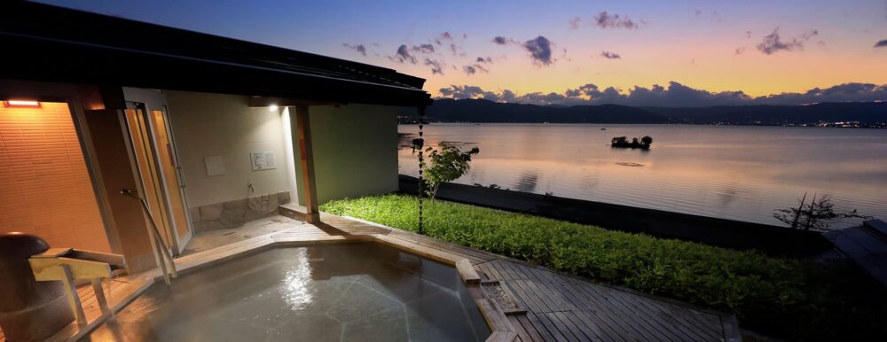 諏訪湖を望む露天風呂や地酒風呂が自慢